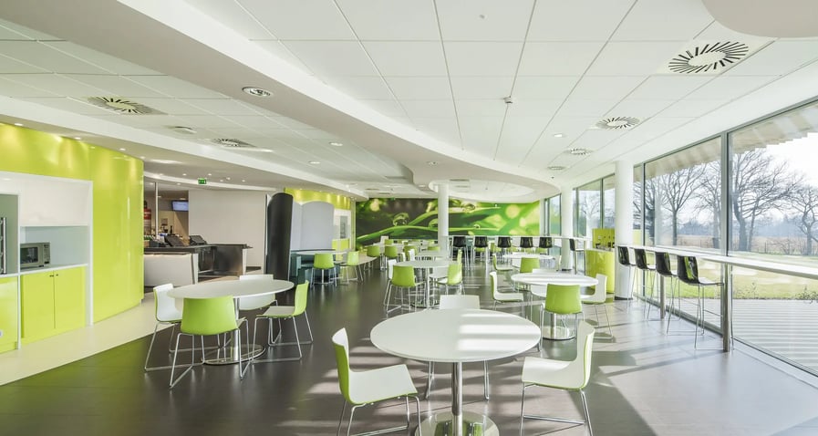 Hall d'accueil, restaurants et cafétéria, salons d'attente, salle du conseil, bureaux de la Direction
