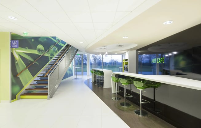 En collaboration avec Jean François GOLHEN , architecte du bâtiment Polaris à Saint Grégoire et avec l'agence Majorelle Forma Design équipe en mobilier de confort le siège de la Banque Populaire du Grand Ouest.